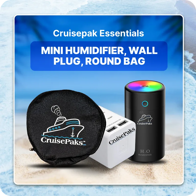 Cruise Essentials Mini USB Colorful Humidifier . Whether you're heading out on a cruise or just need some extra hydration in your cabin room, this travel ultrasonic humidifier is an essential accessory. With its quick-start feature, you'll be breathing easier in no time. Don't let dry air ruin your travels - try the CruisePaks Mini Ultrasonic Portable USB Colorful Humidifier today!